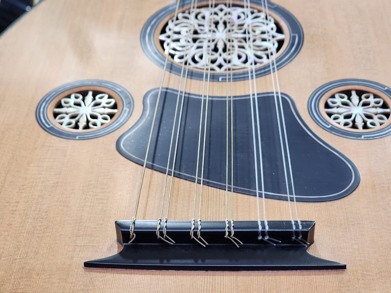 Exquisite Rosette & Soundholes: At the heart of the oud lies an intricately carved rosette, showcasing a labyrinthine pattern of mother-of-pearl inlay. This central feature is surrounded by two smaller soundholes, each bearing matching inlays, that elevate the instrument’s visual complexity. The meticulous craftsmanship reflects a deep-rooted tradition of oud making, yet the modern touches make the Yaldiram a timeless masterpiece.